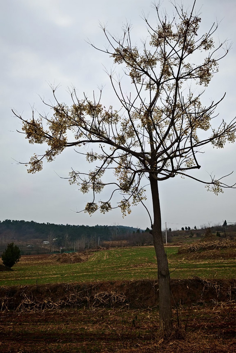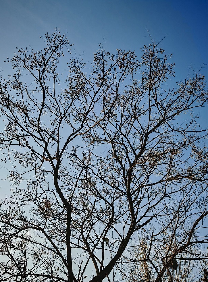 秋冬时节,落叶后的苦楝树更显独特风姿。倔强的树干遒劲有力地伸向天空,枝头缀满淡黄色的果实,如繁星点点,散发着清冷高傲的气质。此景不禁让人联想到孙膑在马陵山独龙涧静候庞涓时的恬静淡然——那份沉淀千年的从容与智慧,正与苦楝树的气质相契合。
