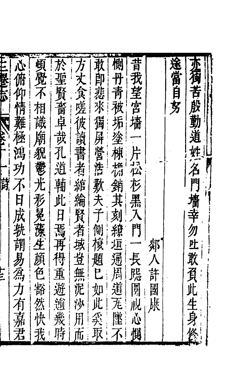许国康,明朝沂州府郯城县人。万历年间,作为门生跟随时任邹县知县的老师胡继先寓居邹县,协助参与重修《邹志》,主要负责卷一、卷二的仝校工作,并在万历《邹志》、《三迁志》中留下了不少诗文歌赋。