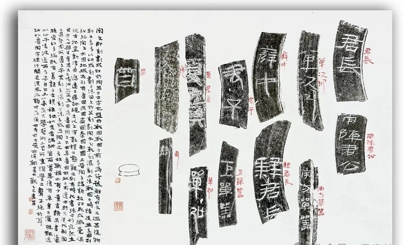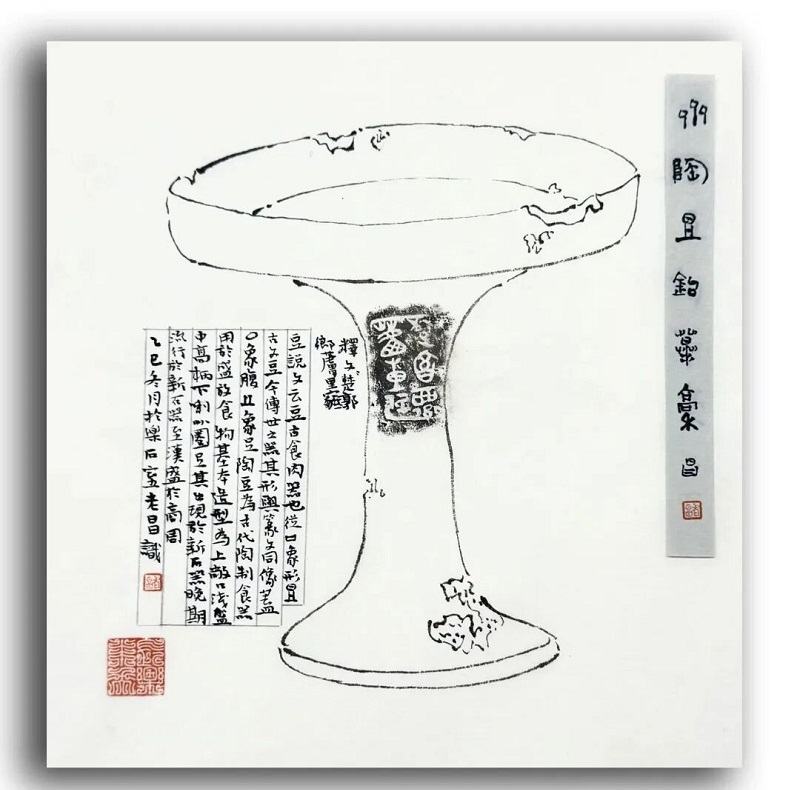 案头陶拓,一为勾摹汉豆,一为鲁陶文,另一为陶灶全形拓。汉豆高足承盘,残处如霜痕初落。腹间铭文寥寥,笔势温厚,仿佛还带着匠人指尖余温。小字题跋,将豆之为器、陶之为工叙说于纸上——这战汉的余韵啊,便从墨痕深处缓缓醒来。