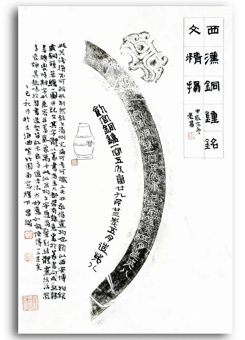 西汉铜锺残拓,篆法流丽如歌,纹样精妍犹存。锺鼎无声,余韵未绝。仿佛两千年前那一声高歌,痛饮三百杯吧,荡过竹帛,荡过尘劫,于今墨痕里,幽幽复起。