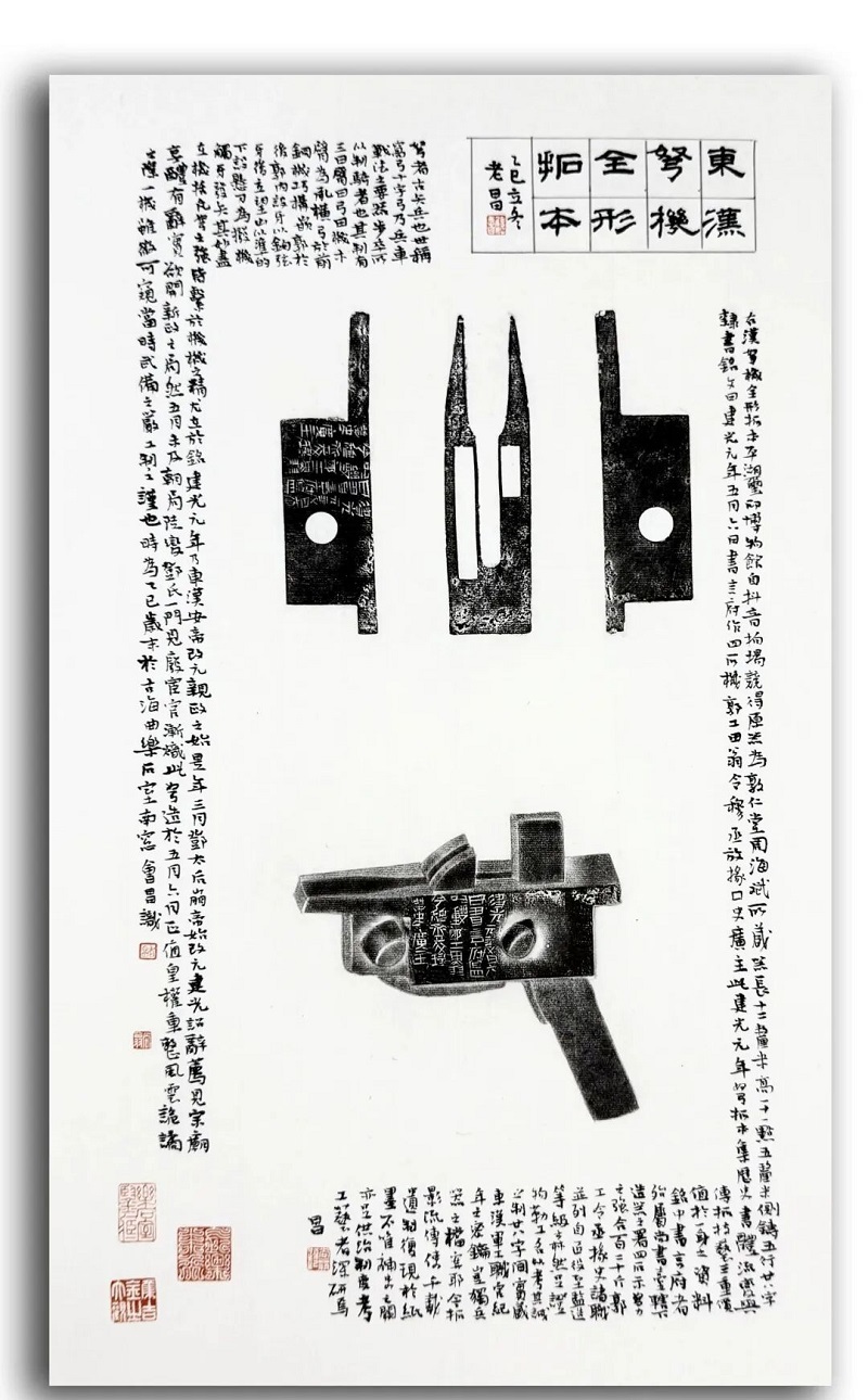 东汉弩机全形拓,构件森然列阵,铭文缜密如篆。指间拂过,恍见当年军阵肃杀,镞羽未发,而金戈交击的清响,已铮铮然穿透纸背。