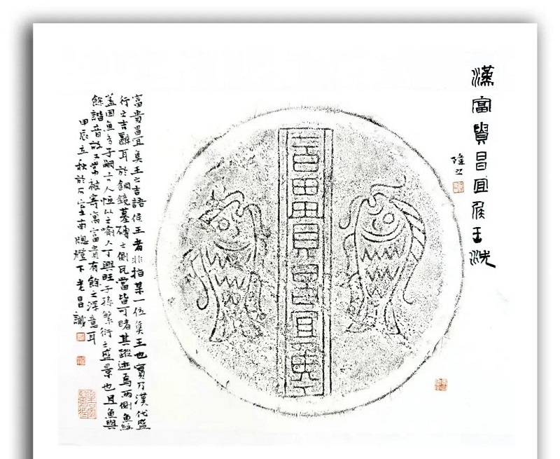 汉铜洗全形拓赫然在目,双鱼图及「富贵昌宜侯王」铭,古意横生。叙铜洗之来历,字里行间,尽是寻常岁月。将两千年风霜与当下闲情融于一纸;岁月流转,而此中静气,足以抵挡世间纷扰。